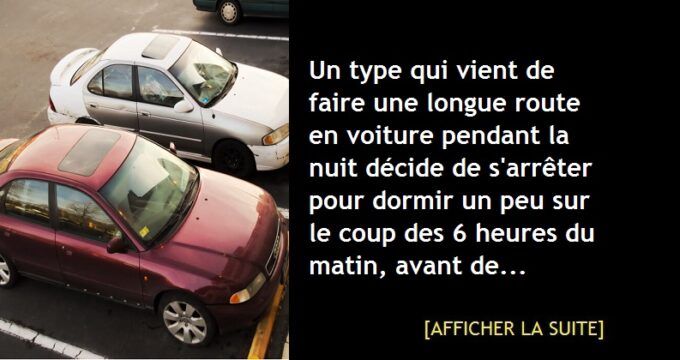 Blague : Un type qui vient de faire une longue route en voiture pendant la nuit décide de s’arrêter pour dormir un peu sur le coup des 6 heures du matin, avant de continuer son chemin, encore long.