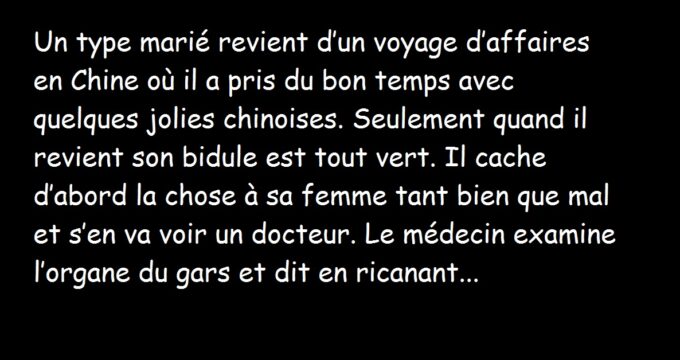Un homme marié revient d’un voyage d’affaires en Chine où il a pris du bon temps avec quelques jolies chinoises. Seulement quand il revient son bidule est tout vert. Il cache d’abord la chose à sa femme tant bien que mal et s’en va voir un docteur. Le médecin examine l’organe du gars et dit en ricanant :
