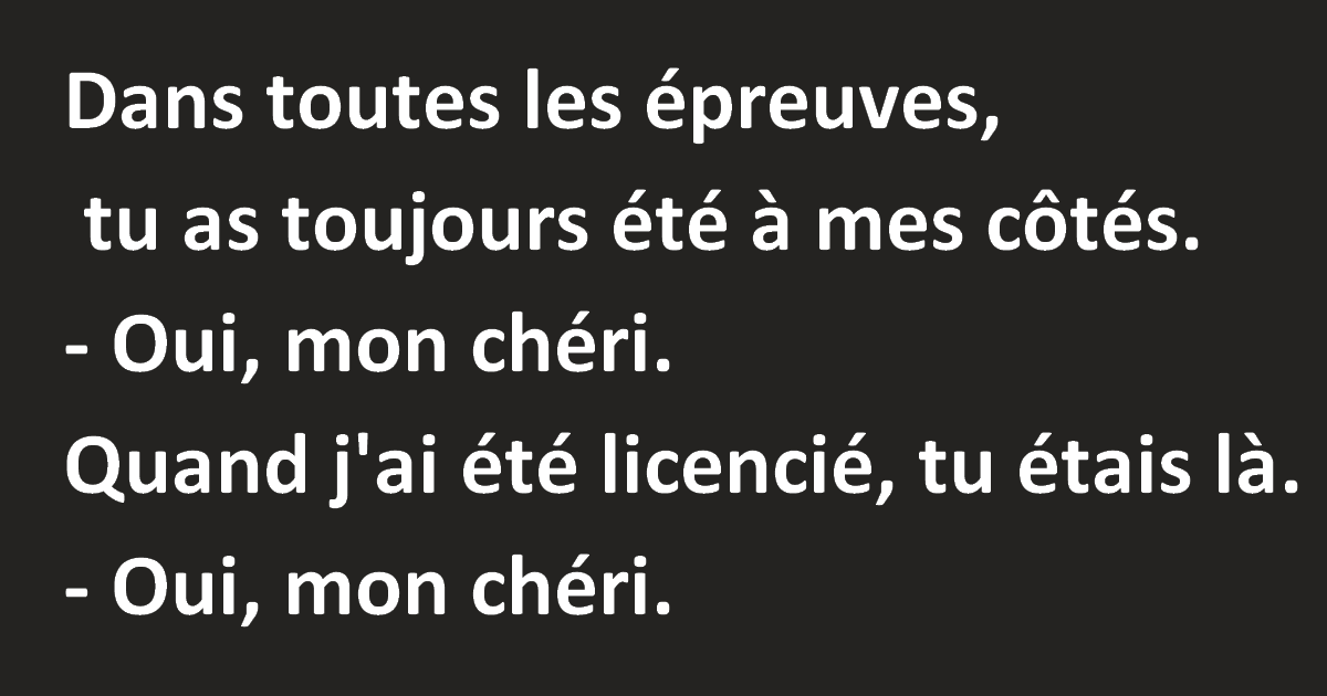 – Dans toutes les épreuves, tu as toujours été à mes côtés. – Oui, mon chéri. – Quand […]