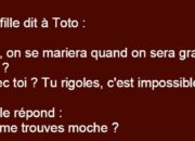 Fast News Une fille dit a Toto : – Dis, on se mariera quand on sera grand Toto ? 24 septembre 2016 • 1 min