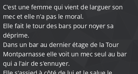 Dans un bar au dernier étage de la Tour Montparnasse elle voit un mec seul au bar qui a l’air de s’ennuyer.