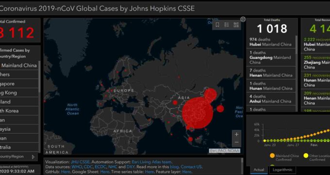 Le Center for Systems Science and Engineering a lancé un tableau de bord en ligne qui permet de suivre la propagation du coronavirus à travers la Chine et au-delà. Le tableau de bord reprend les données de l’Organisation mondiale de la santé (OMS) – ainsi que des centres de contrôle des maladies aux États-Unis, en Chine et en Europe. Il nous montre tous les cas confirmés, suspectés ainsi que les patients guéris et les décès. Les données sont visualisées grâce à un système d’information graphique en temps réel alimenté par Esri.