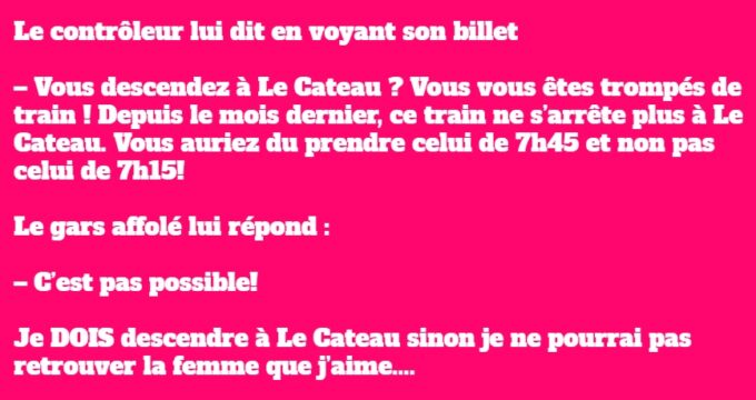 – Vous descendez à Le Cateau ? Vous vous êtes trompés de train ! Depuis le mois dernier, ce train ne s’arrête plus à Le Cateau. Vous auriez du prendre celui de 7h45 et non pas celui de 7h15!
