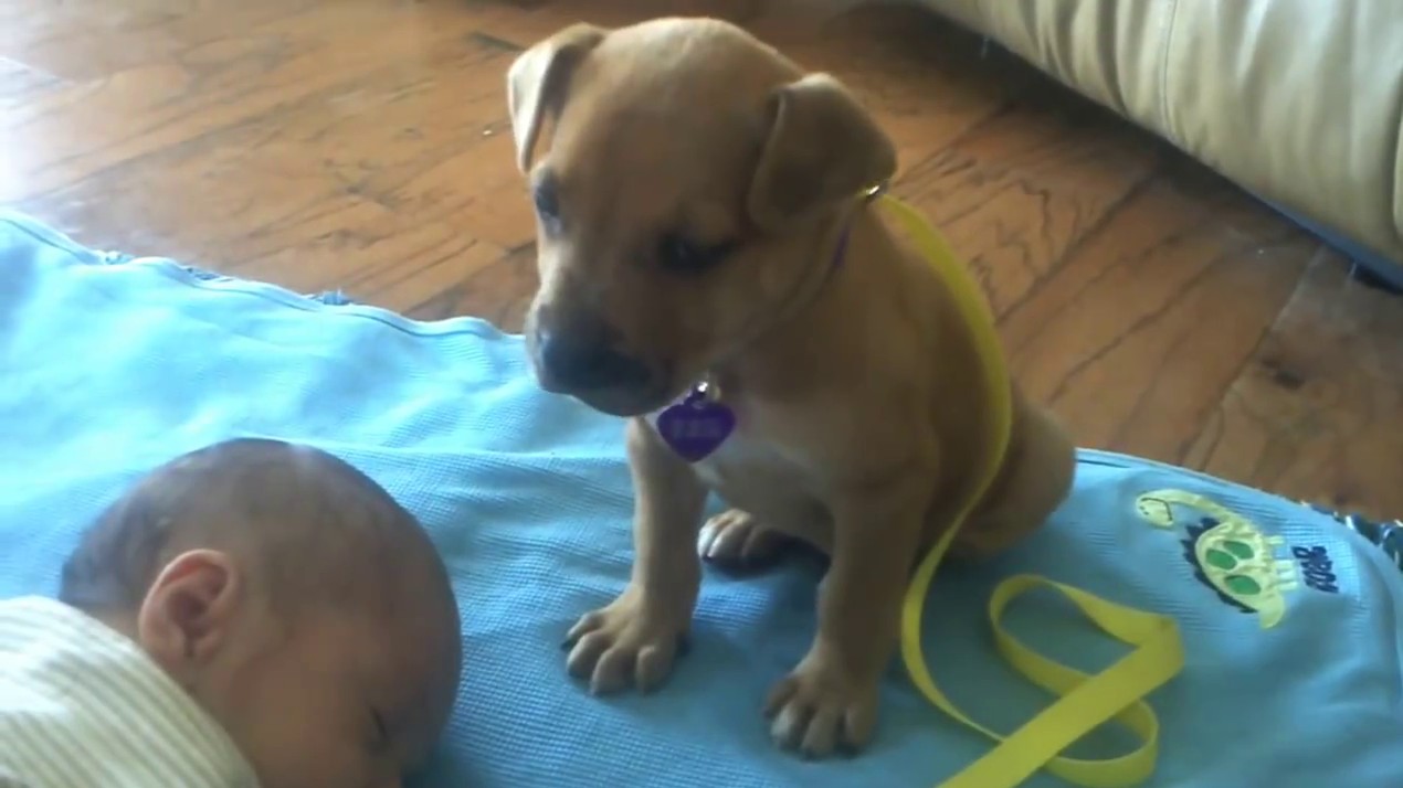 Difficile de faire plus mignon que ce chiot qui n'arrive pas à rester sur ses quatre pattes et qui a une envie folle de dormir en posant sa petite tête sur un bébé
