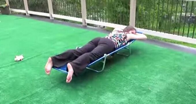 Afin de pouvoir s’étendre confortablement sur le ventre, elle a découpé sa chaise longue, afin d’y passer son ventre. Elle peut ainsi se reposer et son bébé sentir moins de pression.