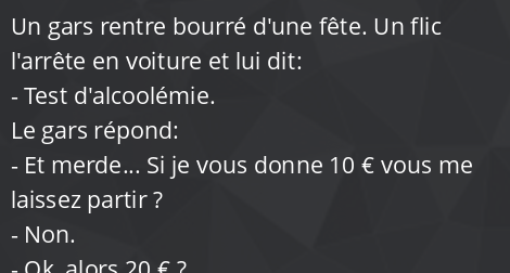 – Oh non, encore un putain de test d’alcoolémie… Ecoutez, est-ce que pour 5 € vous me laisseriez partir ?