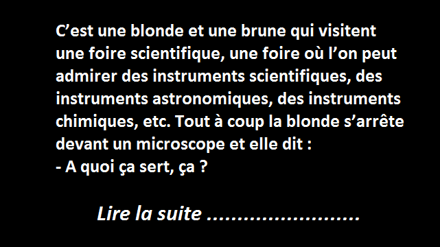 C’est une blonde et une brune qui visitent une foire scientifique, une foire où l’on peut admirer des instruments scientifiques, des instruments astronomiques, des instruments chimiques, etc. Tout à coup la blonde s’arrête devant un microscope et elle dit :
