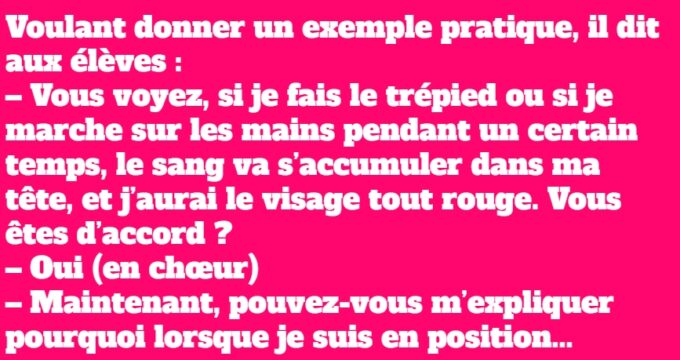– Vous voyez, si je fais le trépied ou si je marche sur les mains pendant un certain temps, le sang va s’accumuler dans ma tête, et j’aurai le visage tout rouge. Vous êtes d’accord ?
