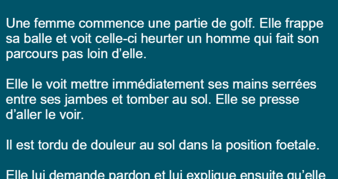 Une femme commence sa partie de golf. Elle frappe sa balle et voit celle-ci heurter un homme qui fait son parcours pas loin d’elle…