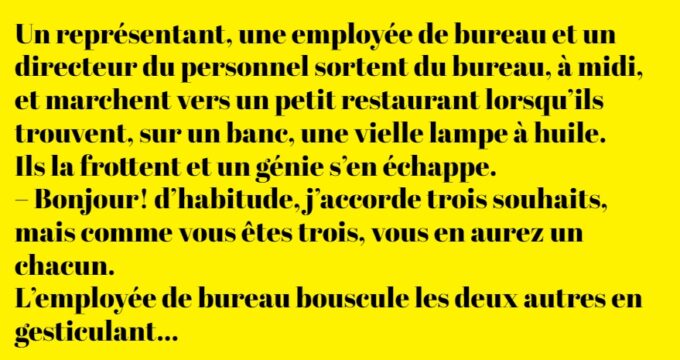 – Bonjour! d’habitude, j’accorde trois souhaits, mais comme vous êtes trois, vous en aurez un chacun.