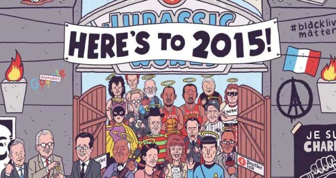 De l’hommage à Charlie Hebdo à la crise Grecque en passant par les migrants, tout y est. Si vous regardez bien attentivement cette illustration, vous pouvez même trouver des événements comme par exemple la mort du lion Cécil ou encore l’annonce de la sortie de Star Wars.