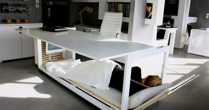 Certaines sociétés inventent des choses plutôt insolites. Dans le cas présent, il s’agit d’un bureau qui a la particularité originale de se transformer en véritable lit. Une innovation qui fera plaisir à certains d’entre vous !