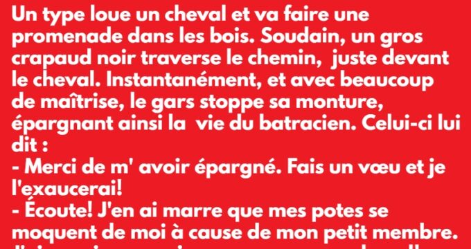 Un type loue un cheval et va faire une promenade dans les bois. Soudain, un gros crapaud noir traverse le chemin, juste devant le cheval. Instantanément, et avec beaucoup de maîtrise, le gars stoppe sa monture, épargnant ainsi la vie du batracien. Celui-ci lui dit :