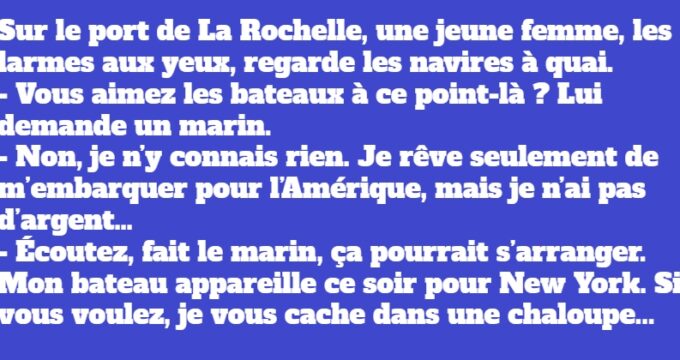 – Écoutez, fait le marin, ça pourrait s’arranger. Mon bateau appareille ce soir pour New York. Si vous voulez, je vous cache dans une chaloupe, et je vous apporte à manger toutes les nuits. Seulement il faudra être gentille et me faire des gros câlins…