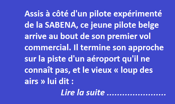 Assis à côté d’un pilote expérimenté de la SABENA, ce jeune pilote belge arrive au bout de son premier vol commercial. Il termine son approche sur la piste d’un aéroport qu’il ne connaît pas, et le vieux « loup des airs » lui dit :