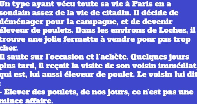 Il saute sur l’occasion et l’achète. Quelques jours plus tard, il reçoit la visite de son voisin immédiat, qui est, lui aussi éleveur de poulet. Le voisin lui dit :