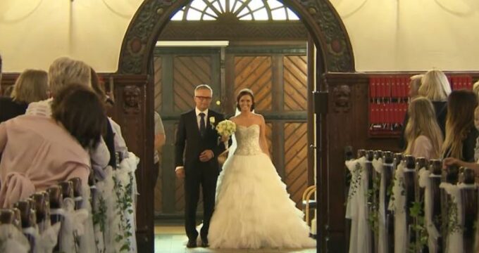 La mariée descend l’allée avec son père, mais regardez bien ce qu’elle tient dans la main gauche!