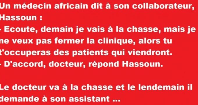 – Ecoute, demain je vais à la chasse, mais je ne veux pas fermer la clinique, alors tu t’occuperas des patients qui viendront.