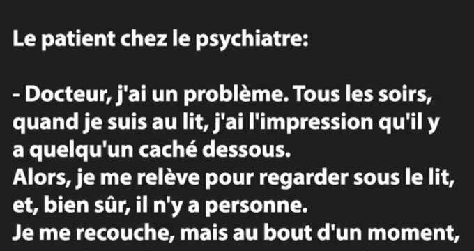 Le patient chez le psychiatre : – Docteur, j’ai un problème. Tous les soirs, quand je suis au lit,