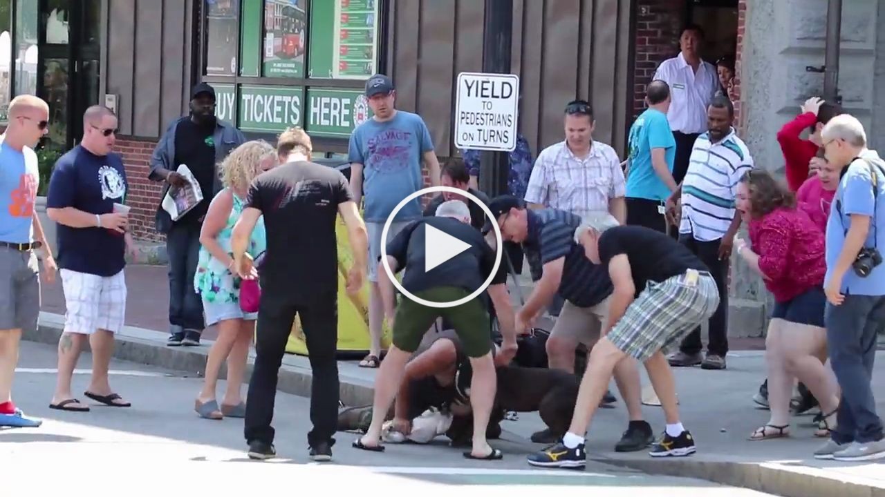 Dans une rue de Boston, une femme essaie de protéger son chien contre l’attaque d’un pitbull. La scène s’est déroulée le 30 juillet 2016.