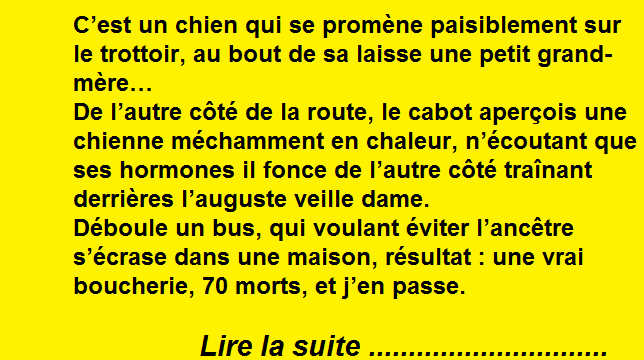 De l’autre côté de la route, le cabot aperçois une chienne méchamment en chaleur, n’écoutant que ses hormones il fonce de l’autre côté traînant derrières l’auguste veille dame.