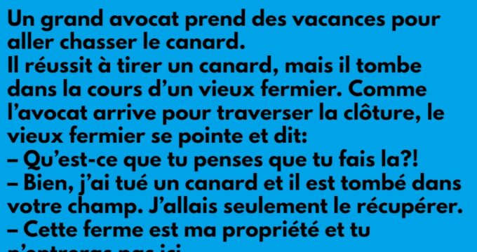 Il réussit à tirer un canard, mais il tombe dans la cours d’un vieux fermier. Comme l’avocat arrive pour traverser la clôture, le vieux fermier se pointe et dit: