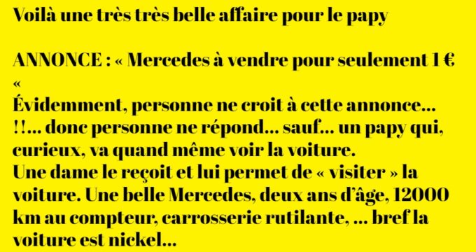 Le papy, intrigué, questionne la vendeuse : « » Je ne comprends pas Madame, vous vendez cette belle Mercedes pour SEULEMENT 1 € …. ????