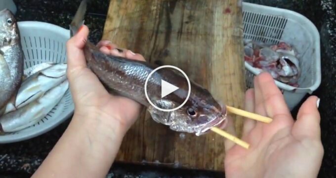 Une femme montre une technique pour vider un poisson en utilisant deux baguettes. Elle enfile chaque baguette, l’une après l’autre, dans le corps du poisson en passant par la gueule, puis elle serre les baguettes l’une contre l’autre et les retire de l’animal.